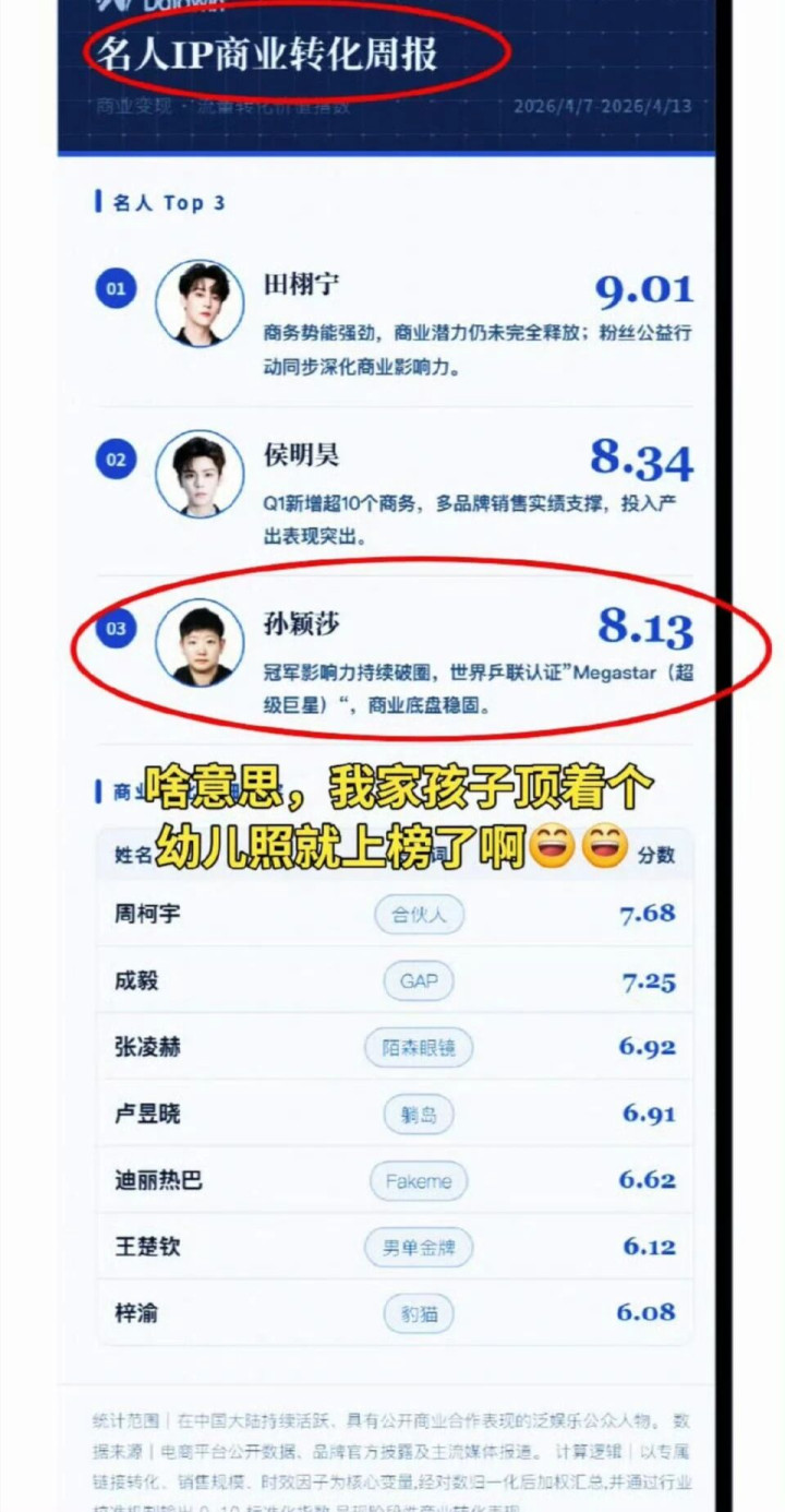 近日,有网友晒了一张干系机构统计的名东谈主IP升沉周报,在这个榜单中,田栩宁以9.01的评分排在第一,侯明昊则以8.34的评分排在第二。 值得一提的是排在第三的是乒乓球领路员孙颖莎,IM体育官方网站首页她的评分是8.13,在她死后的还有成毅、张凌赫、迪丽热巴等一众文娱圈顶流明星。