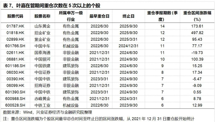 2025Q4本期重仓股中的新面孔有云铝股份、同力天启、中金黄金。PS.提及重仓股不构成投资建议,只为了看清楚加仓方向。 之前有兴业证券的研报统计了现任基金经理叶嘉在管期间重仓次数在5次以上的个股(截至20250930),详见下表。