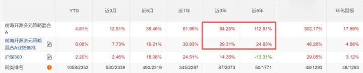 这只近三年夏普比率优秀、机构又非常认可,回撤控制也很好、规模不大的基金——前海开源多元策略混合A确实引起了我的好奇,我发现其基金的四季报已经出炉了,本文就来聚焦这只基金挖掘更多一些数据,顺便看看基金经理四季报的最新观点、投资操作动向。 一、能涨抗跌:超额回报显著 前海开源多元策略混合A是一只灵活配置型基金,成立于2017年7月3日,其长期业绩表现堪称“穿越牛熊”的典范。 首先,该基金成立至今经历了三位基金经理,值得一提的是,每任基金经理的任职回报都是正收益。