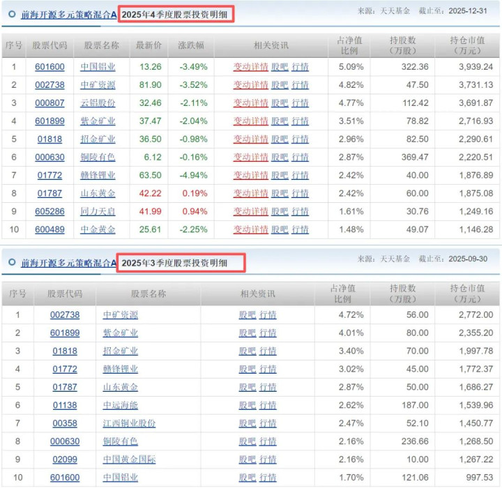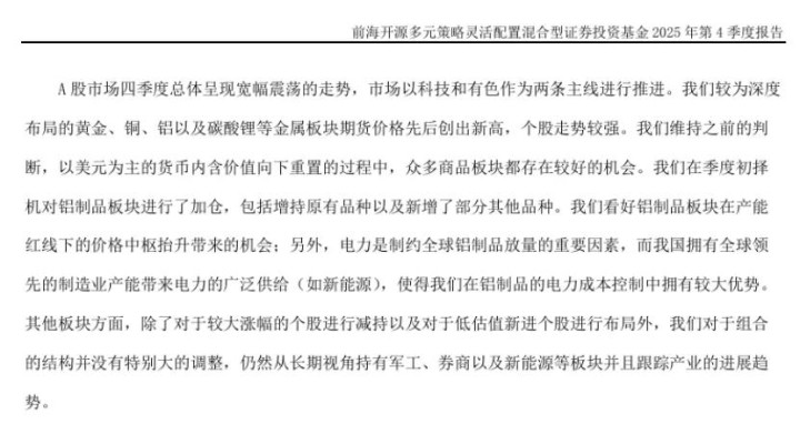 看了一些叶嘉的访谈,摘录的一些观点,大家可以感受一下:“倾向于关注被市场忽视的低估行业,而非追逐热点”、“不贪鱼尾收益”、“左侧布局,绝对收益优先”。 2025年四季报显示,前海开源多元策略混合A(004496)持仓组合结构并没有特别大的调整,仍然战略性看好黄金、有色等商品板块,同时也会战术性等待市场低位机会,择机布局。
