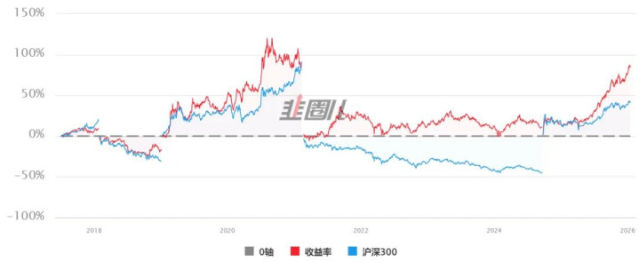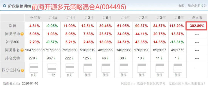 其次,从业绩表现来看,该基金各维度表现都很能打。截至2026年1月16日,该基金成立以来涨幅高达302.89%,近1年、近2年、近3年、近5年均大幅度跑赢同类平均及沪深300指数,四分位排名均是优秀。