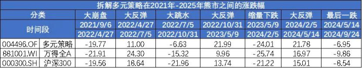 下面我们再按照阶段性牛熊市来看看基金的阶段性表现。 我以现任基金经理开始接管前海开源多元策略混合A的时间2021年9月6日为起点进行分析,2021年9月也正好是万得全A指数的高点。 熊市中:多元策略在20210906到20240924的涨跌幅是-10.31%,同期沪深300是-30.79%,万得全A是-28.72%。在所有主动股混基金中,多元策略排名363/3205,位列前11.3%。 牛市中:多元策略在20240924到20251205的涨跌幅是74.86%,同期沪深300是42.70%,万得全A是59.41%。在所有主动股混基金中,多元策略排名626/3205,位列前19.5%。 进一步拆解熊市中更细致的涨跌幅情况,我们可以发现除了在2022年4月27日到2022年7月5日的大反弹中,多元策略的收益率弱于万得全A和沪深300,其他的阶段多元策略基本都有超额,实现了“下跌时相对抗跌,上涨时有力跟上”的良性循环。