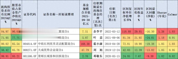 前段时间写了一篇文章:《近三年夏普比率大于1.0,来看看都有谁上榜》,提及了37只近三年夏普比率大于1.0的偏股基金,个人觉得挺有研究价值的。 如果还要优中选优,我们不妨在机构持有比例和最大回撤方面给出一些更多限制:比如要求机构非常认可,取2025Q2机构占比大于50%;再要求近三年最大回撤控制在-25%以内。 最终全市场仅有5只基金脱颖而出。 分别是中欧红利优享灵活配置混合A、大成优势企业混合A、交银荣鑫灵活配置混合A、前海开源多元策略混合A、景顺长城泰和回报混合A。 五只基金按照近三年夏普比率由高到低排序如下: