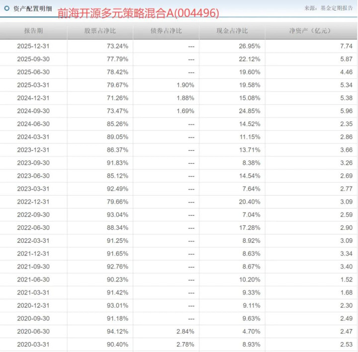 前海开源多元策略混合A近三年夏普比率超过了蓝小康和刘旭在管的基金,且当前规模也不算很大,还是挺值得研究一下的,而且前海开源多元策略混合A虽然是灵活配置型基金,但他的权益仓位波动比交银荣鑫灵活配置混合稳定多了,过去连续六期的股票占净比均在70%+,最新一期2025Q4股票占净比是73.24%。