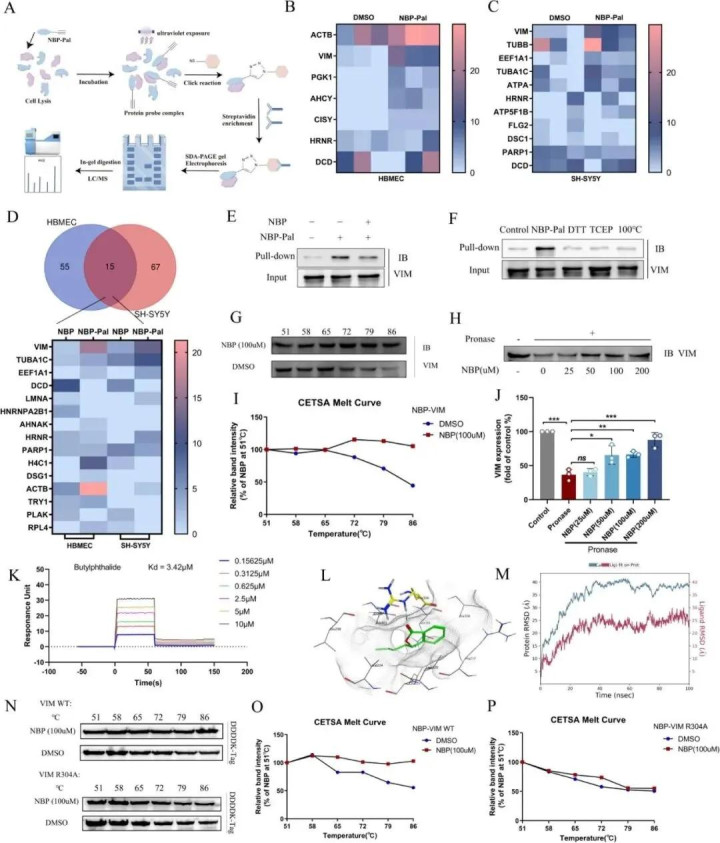2.VIM被果决为NBP的径直作用靶点 PAL-CC-ABPP衔尾LC-MS/MS分析截止暴露,VIM在血管内皮细胞和神经元中均与NBP特异性衔尾。同期,分子对接与突变实考据实,NBP衔尾于VIM的Arg 304残基,该位点为功能关键点。该截止考据了NBP与VIM之间存在特异性且踏实的互相作用,其解离常数KD为3.42 μM。