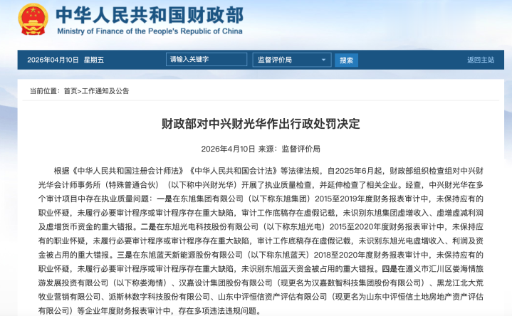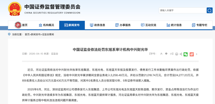 东旭系审计机构中兴财光华被两部门共计罚没2.52亿元。 4月10日,证监和会报称,近日,河北证监局照章对中兴财光华管帐师事务所(零散平日合资)(以下称“中兴财光华”)执审东旭集团、东旭光电、东旭蓝天年报及股票刊行、债券刊行职责未奋发尽职案作出行政惩处,依据《中华东谈主民共和国证券法》礼貌,充公中兴财光华案涉时辰一谈业务收入3258.49万元,并处以罚金21018.74万元,共计罚没24277.23万元,并对6名职守东谈主员处以10万元至430万元不等罚金,对其中2名职守东谈主员区分摄取10年、5年证券商场禁入步履。