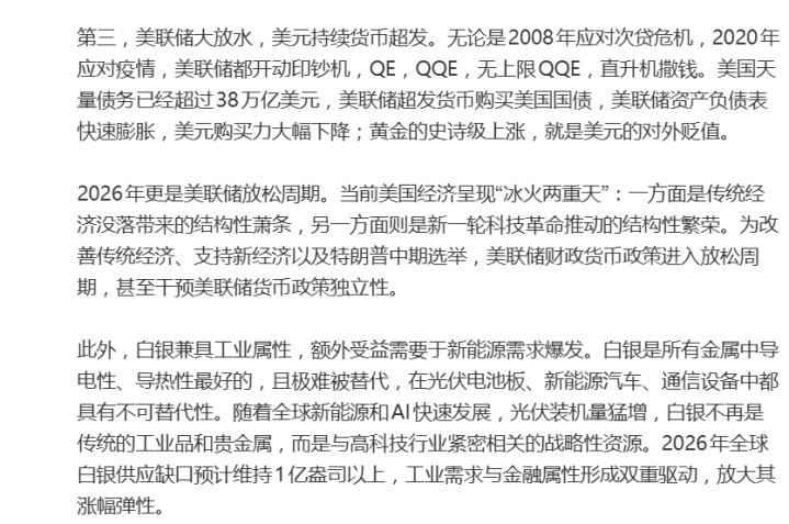 金银正经历史诗级牛市,开年更是暴涨逼空。2025年黄金涨幅超60%、白银近150%,创下历史最强年度表现;2026年开年至今,黄金涨超15%突破5100美元关口,白银涨幅更是飙升超40%,突破100美元/盎司整数关口。 著名经济学家任泽平在社交媒体发文称,这背后有三大驱动逻辑: 第一,全球地缘动荡、大周期末期,避险需求拉满。全球处于大周期末期,旧秩序开始瓦解,新秩序正在重建,这是一个大变革、大调整、大动荡、大转型的新时代。委内瑞拉变局、格陵兰岛争端、美欧关税战等事件频发,金银作为避险资产的配置价值空前凸显。 第二,逆全球化与去美元化,重构金银定价逻辑。美国挑起关税战,引发全球贸易摩擦,逆全球化思潮蔓延。同时,全球去美元化,美国财政赤字高企、美联储独立性遭到侵蚀,多国央行抛售美元、加速增持黄金,美元占全球外汇储备从71.2%降到56.9%,下降了14个百分点,过去六年就下降了5个百分点。 第三,美联储大放水,美元持续货币超发。无论是2008年应对次贷危机,2020年应对疫情,美联储都开动印钞机,QE,QQE,无上限QQE,直升机撒钱。美国天量债务已经超过38万亿美元,美联储超发货币购买美国国债,美联储资产负债表快速膨胀,美元购买力大幅下降;黄金的史诗级上涨,就是美元的对外贬值。 2026年更是美联储放松周期。当前美国经济呈现“冰火两重天”:一方面是传统经济没落带来的结构性萧条,另一方面则是新一轮科技革命推动的结构性繁荣。为改善传统经济、支持新经济以及特朗普中期选举,美联储财政货币政策进入放松周期,甚至干预美联储货币政策独立性。 此外,白银兼具工业属性,额外受益需要于新能源需求爆发。白银是所有金属中导电性、导热性最好的,且极难被替代,在光伏电池板、新能源汽车、通信设备中都具有不可替代性。随着全球新能源和AI快速发展,光伏装机量猛增,白银不再是传统的工业品和贵金属,而是与高科技行业紧密相关的战略性资源。2026年全球白银供应缺口预计维持1亿盎司以上,工业需求与金融属性形成双重驱动,放大其涨幅弹性。
