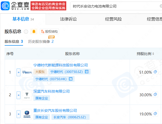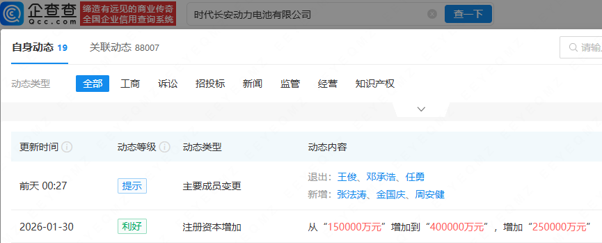 近日,时期长安能源电板有限公司发生工商变更,注册本钱由15亿元增至40亿元,增幅约167%,同期,游戏平台公司主要东谈主员亦发生变更。企查查涌现,时期长安能源电板有限公司确立于2023年6月,法定代表东谈主为朱云峰,由宁德时期(300750)、深蓝汽车科技有限公司、长安汽车(000625)共同执股。