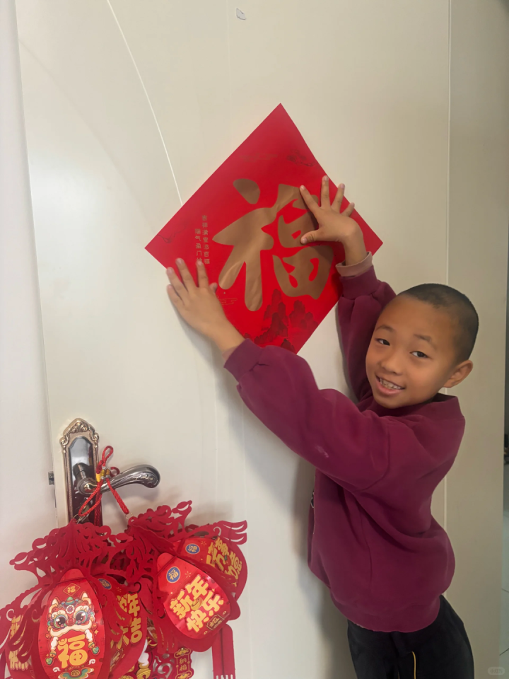 孩子、春联与好意思食。读者“郑舒予”供图 郑舒予:年是穿过侵略灯火、归向团圆的一场暖。
