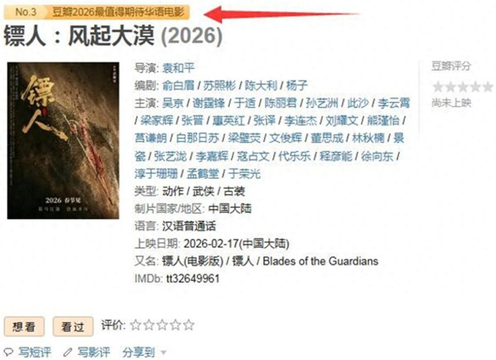 要说本年的春节档电影里,最让咱们期待的电影是哪一部,那必须是吴京主演的《镖东说念主:风起大漠》,该片从定档运转,便稳居“豆瓣2026最值得期待华语电影”第三名,从其主创团队和演员威望来看,此评价实至名归。