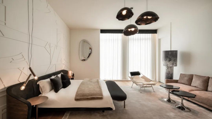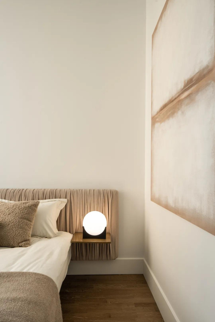 另一间卧室以暖和的驼色为主调,呈当前光中的暖和,似乎将空间千里淀在岁月中,容身当下,瞻望改日。