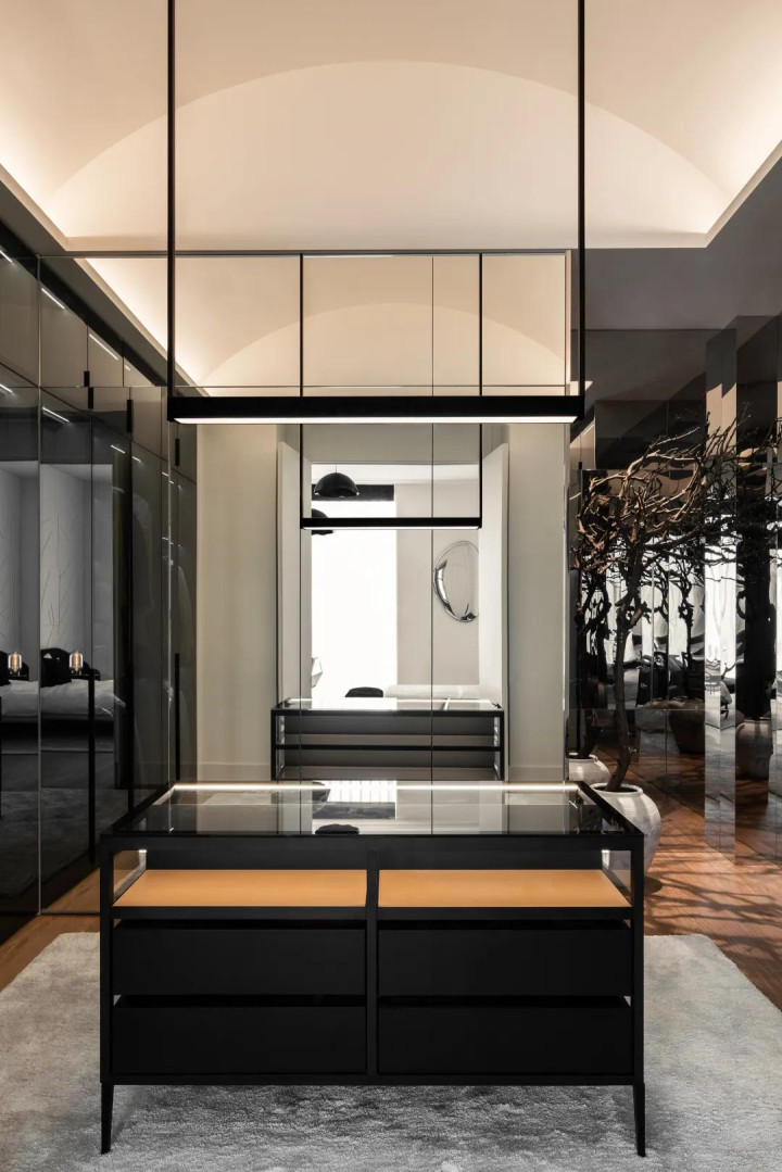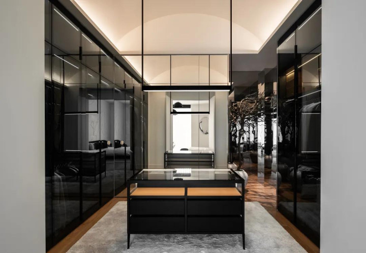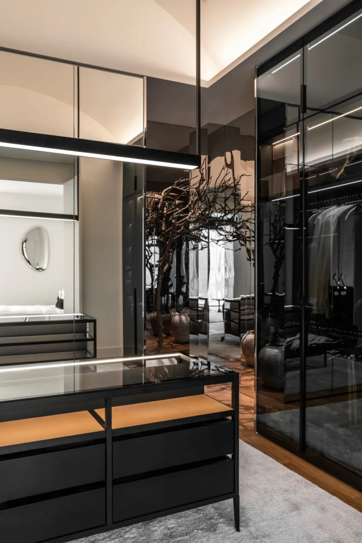 步入式更衣室加入几何元素,用暗色透明重叠绽放区域,既保证功能性,又保证好意思不雅性。