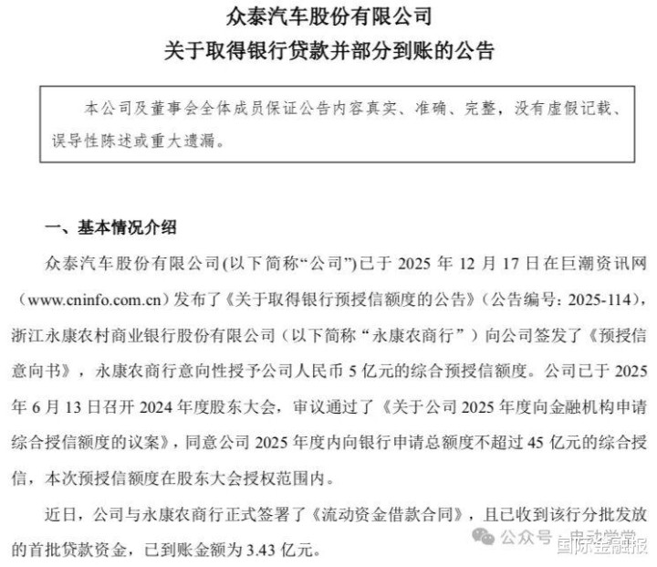 “盗窟车始祖”众泰汽车疑似要复产了。 近日,众泰汽车败露的《对于赢得银行贷款并部分到账的公告》浮现,公司与浙江永康农村生意银行签署4亿元《流动资金借债契约》,首批3.43亿元已到账。