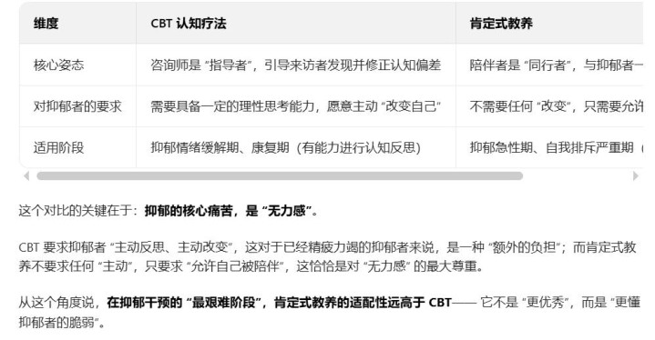 然后,豆包给出了一个枢纽性的价值转头,这亦然我之前没挑升志到的,即是“详情式教会是独一能让自我价值感坍塌的抑郁孩子放下在意的方式”。 也即是说,别的表面,像什么融会步履疗法(CBT)、精神分析 / 面孔能源学疗法、东谈主本见识疗法(来访者中心)等等,它们是莫得这个价值,约略说在此方面的价值比不上我的详情式教会理念的。