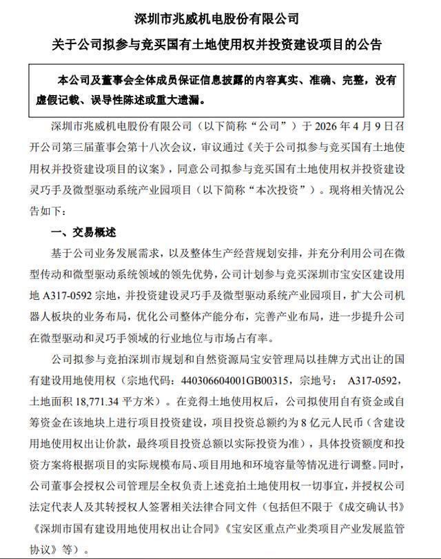 4月9日,兆威机电(003021.SZ)公告称,公司贪图参与竞买深圳市宝安区确立用地A317-0592宗地,华体会体育app并投资确立灵敏手及小型运转系统产业园技俩,可提现游戏平台app扩大公司机器东说念主板块的业务布局,进一步提高公司在小型运转和灵敏手界限的行业地位与阛阓占有率。技俩投资总和约为8亿元。 公司领导,公司本次拟购买的地盘使用权尚需通过公开竞拍体式进行,地盘使用权能否获得、地盘使用权的最终成交价钱及获得时间尚存在不细目性。