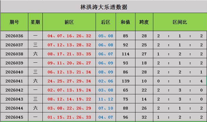 大乐透上期开奖号码:前区01、15、21、26、33,后区04、07,前区号码和值96,跨度32,区间比为1:2:2。
