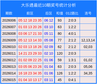 开出的前区奖号012路比为0:4:1,无连号,和值为45。 第2026016期大乐透数据统计分析