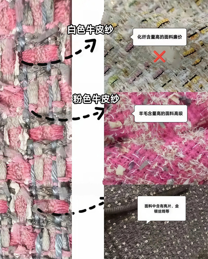 第二部分:“小香风+半裙”的搭配精髓,在于名目挑选 >>>小香风外衣的挑选手段 01:拒却含化纤维高的面料,太低价 小香风外衣能穿出贵气,百分之八十归功于面料,真无意的小香风外衣,用的是羊毛混纺或纯羊毛粗花呢,穿在身上挺括有型,抨击易起球变形。 市面上好多低廉的小香风用的是化纤含量高的面料,瞭望还行,近看就泛着塑料般的贼亮,软塌的撑不起来。