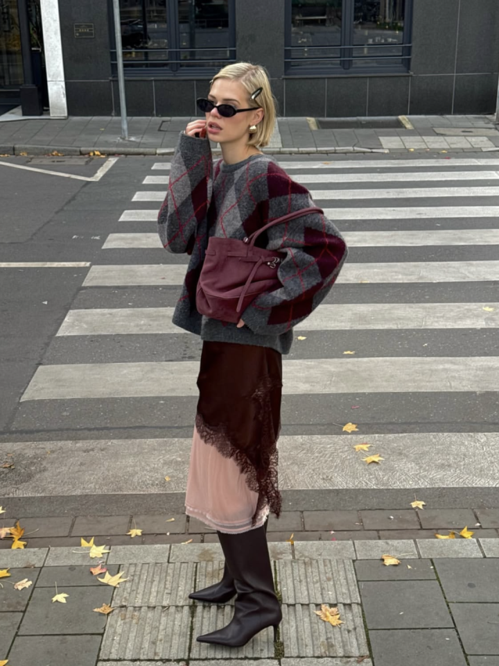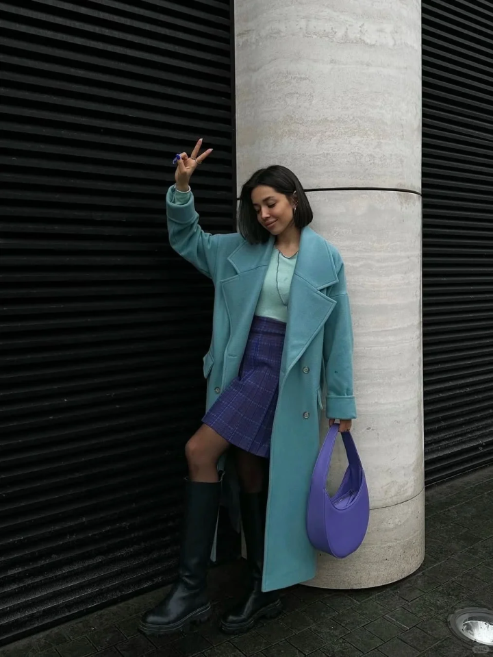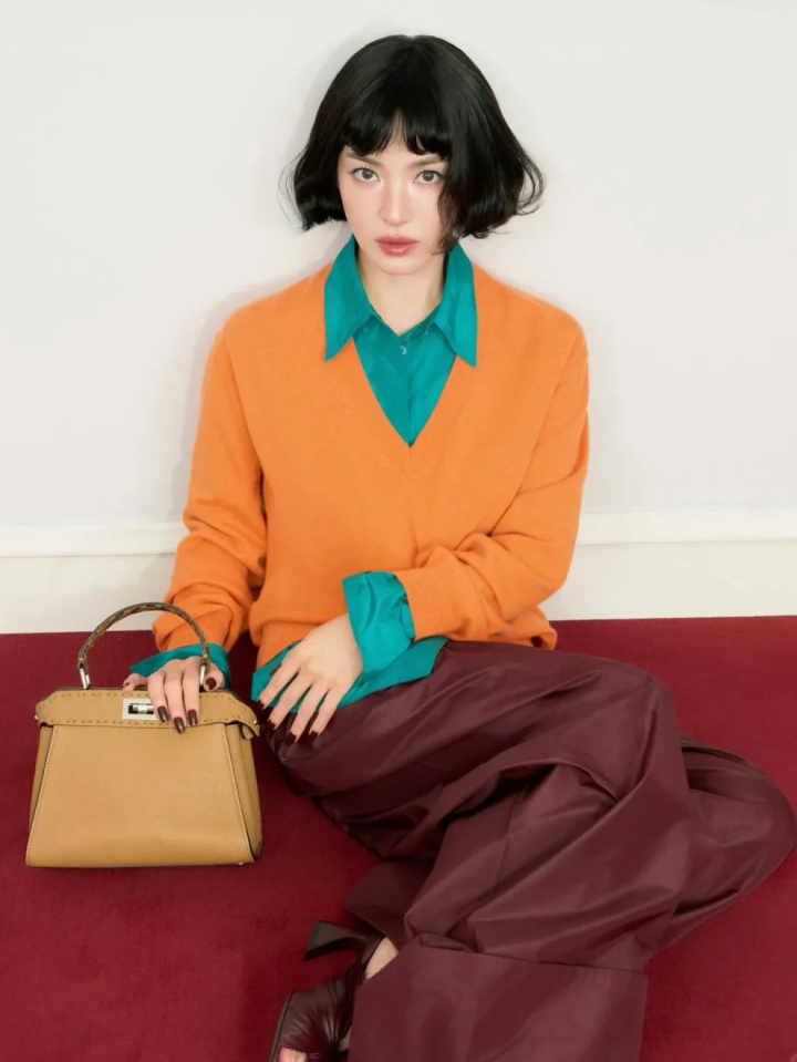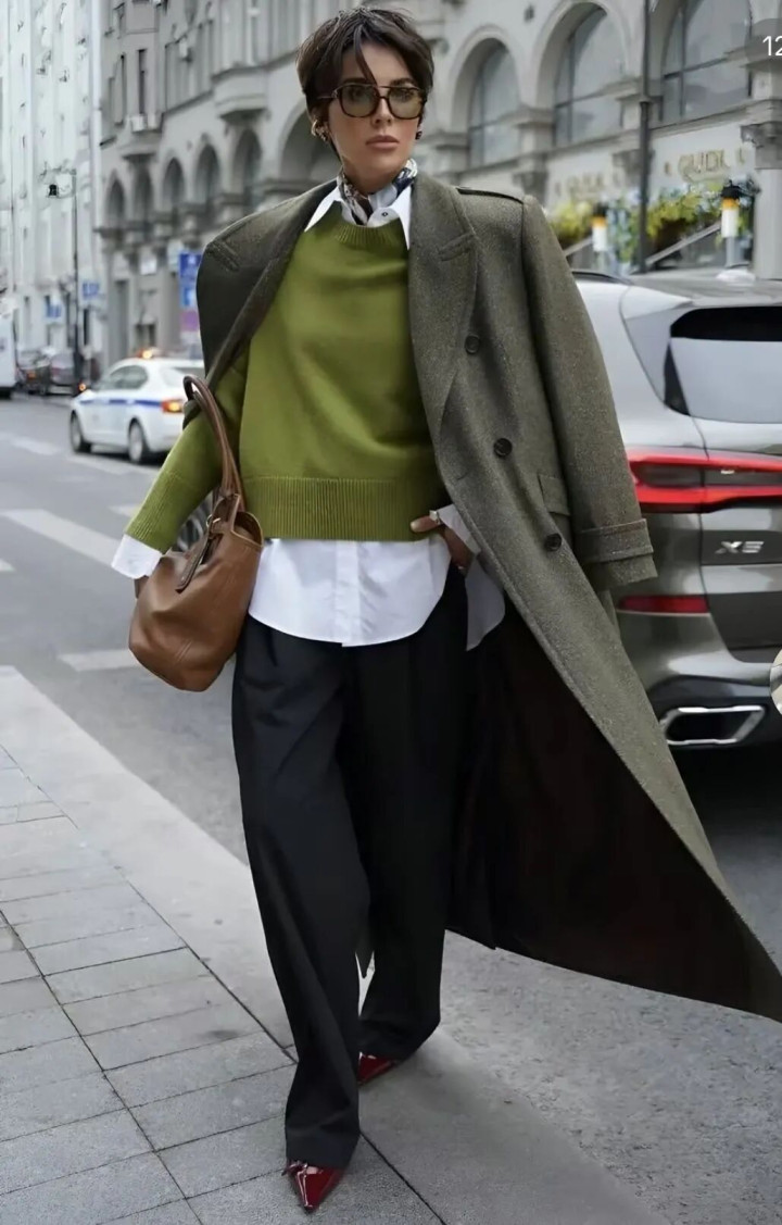 试试“长短灰打底,彩色当主角”的搭配逻辑,这么既不会脱离我方熟练的基础色,又能让彩色成为造型的亮点,高档感和吸睛度双在线。