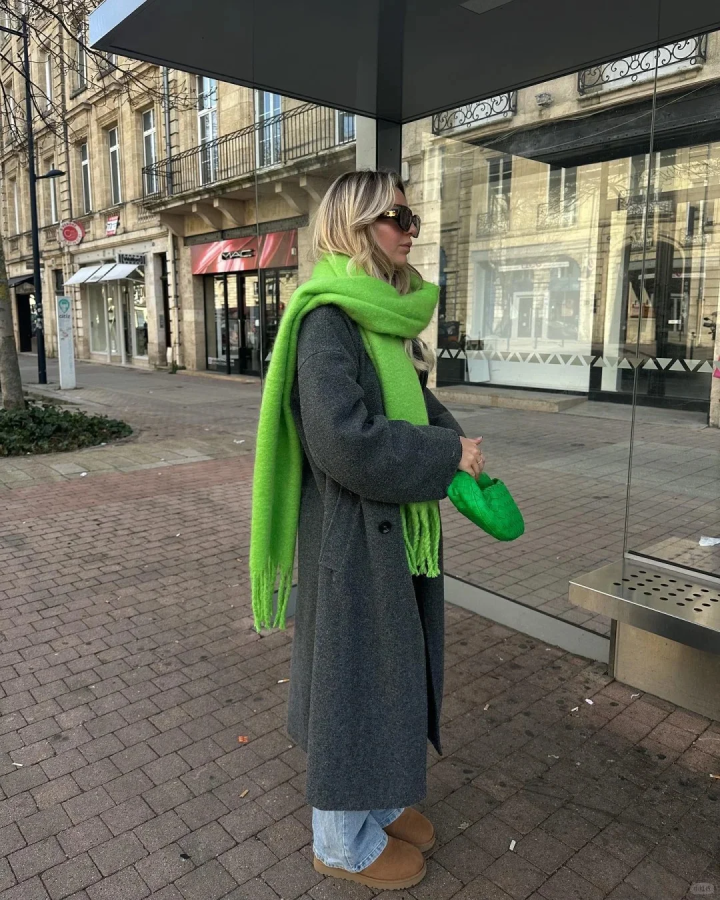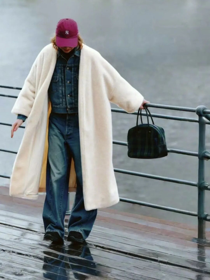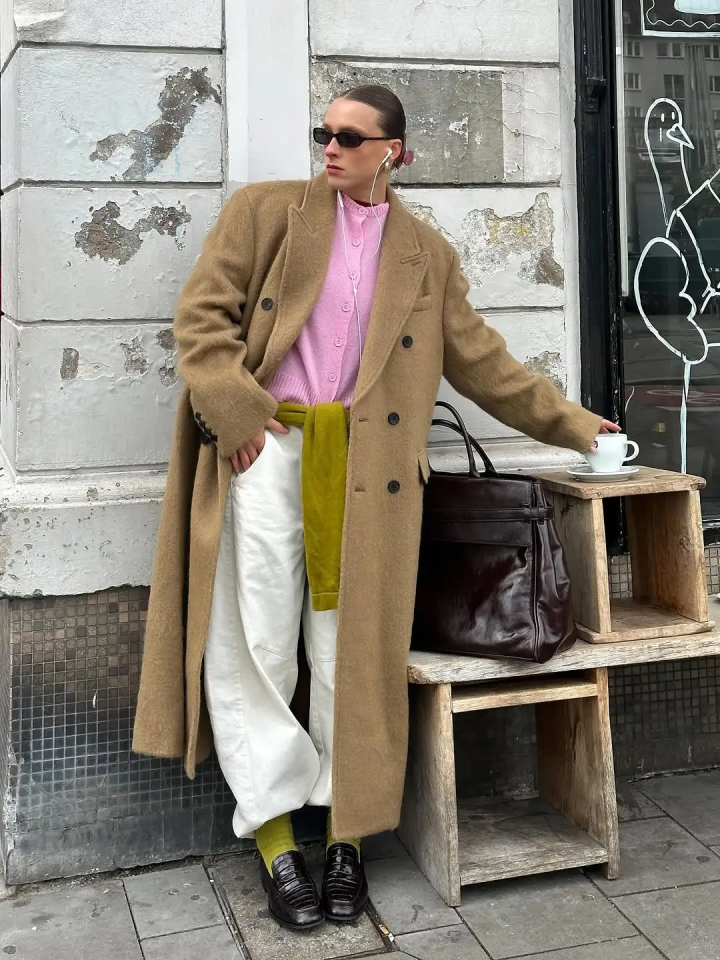 02.基础色打底+彩色主角 不是绝对销毁基础色,而是让彩色与长短灰驼高明碰撞,既保留质感,又自带吸睛buff。
