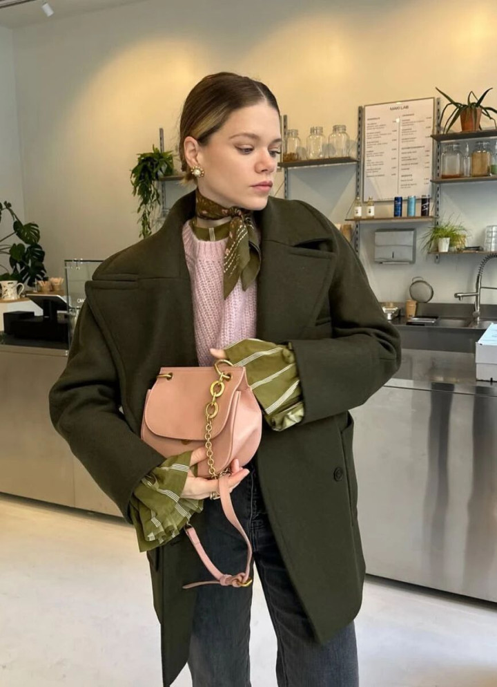 包包亦然绝佳的“彩色器具”,雾霾蓝的腋下包、草绿色的托特包,往身上一挎,千里闷感径直隐藏一半。