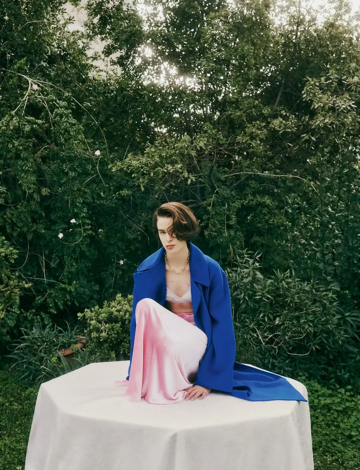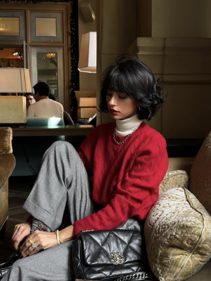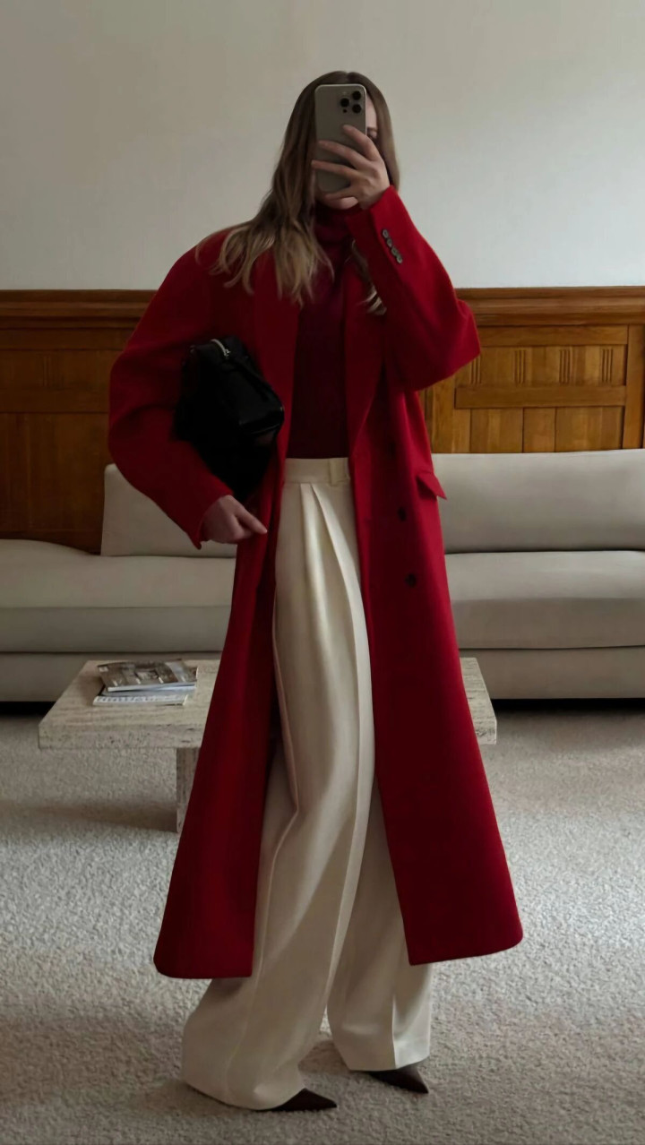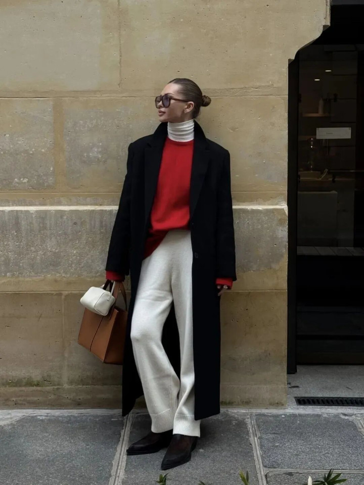 比如用粉色毛衣+粉色裤子作念打底,外搭一件燕麦色廓形西装,利落又有活力;省略玄色大衣+白色阔腿裤,再穿一件红色毛衣,温暖中带着元气,冬天穿出去拍照超上镜。