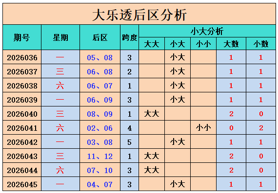上期总结:大乐透第2026045期奖号为:前区01、15、21、26、33,后区04、07,前区奖号和值为96,后区开出小大组合04、07