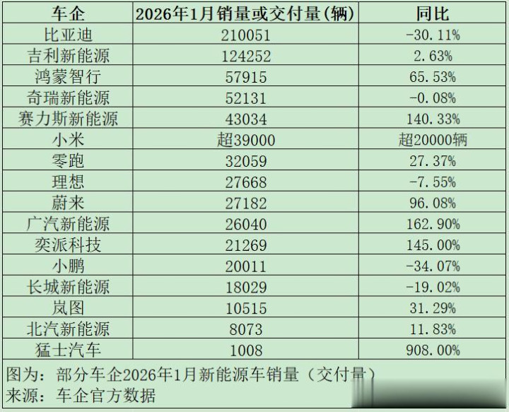 2月1日晚,雷军在北京亦庄直播回应小米汽车1月交付量环比下降争议,称第一季度是传统淡季,且初代SU7已停售,目前主要交付车型为YU7,当前成绩已属不易。 对比来看,正规澳门游戏官网1月仍有多家新能源车企报喜。赛力斯、蔚来公司、岚图汽车等主打中高端新能源汽车市场的车企,1月交付量(销量)同比分别增长104.85%、96.08%、31.29%。