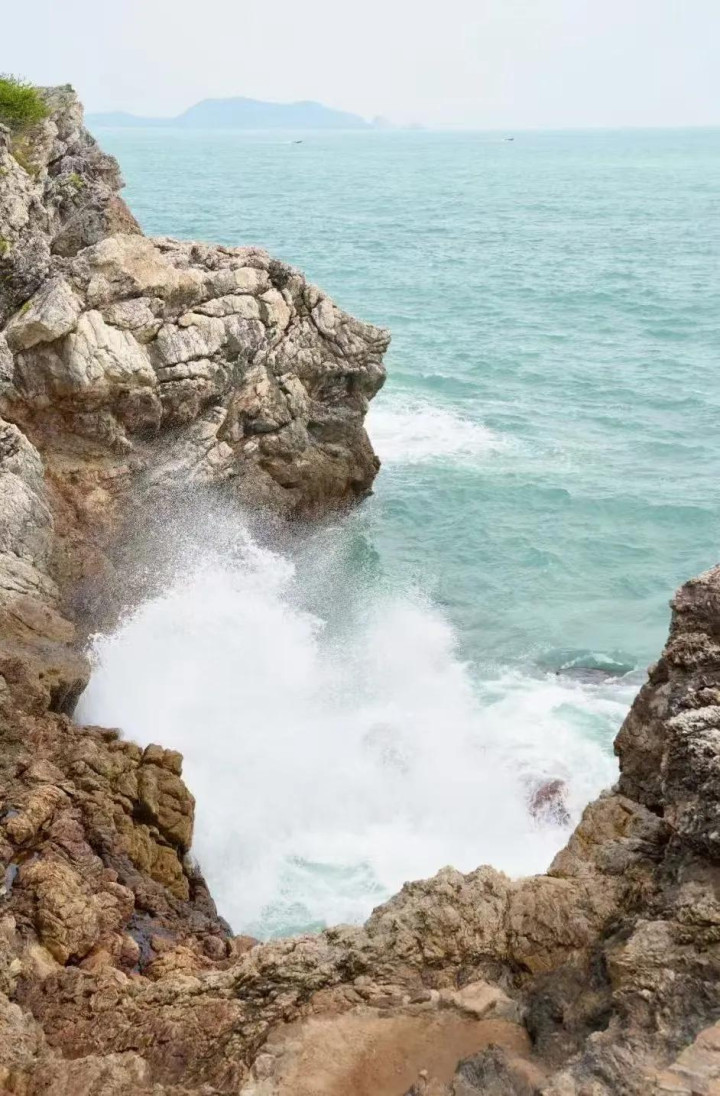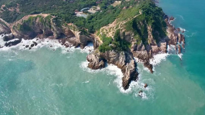 晴时,海水如玻璃熔铸,通透见底;航拍之下,海蚀洞与巨礁如邃古巨兽的骨骼,在浪涛中静卧。
