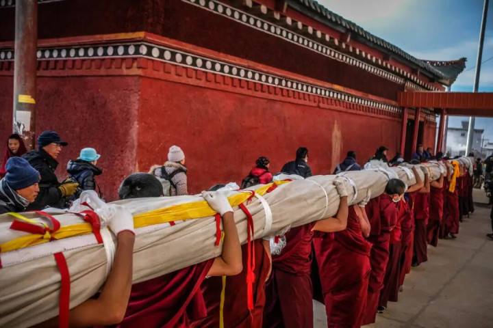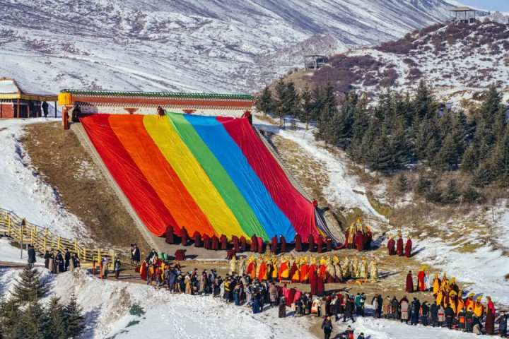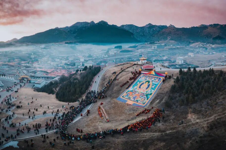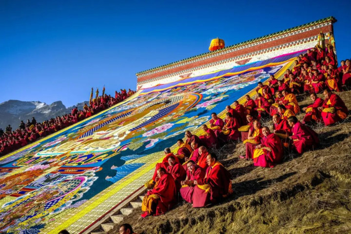 历史传承的巨幅唐卡渐次伸开在众东说念主眼前 供四面来的信仰者钦慕、祝福