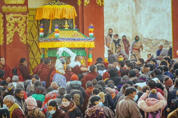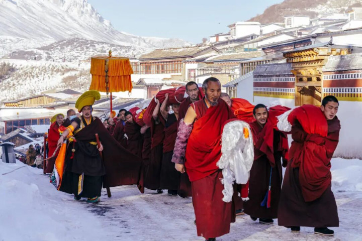 当第一场雪落下,草原褪去了青绿 庙宇的金顶在白雪中愈发忽闪 转经筒的动弹声在风雪中衬得愈发明晰 一场场酝酿了许久的习尚盛典 正顺次拉开序幕