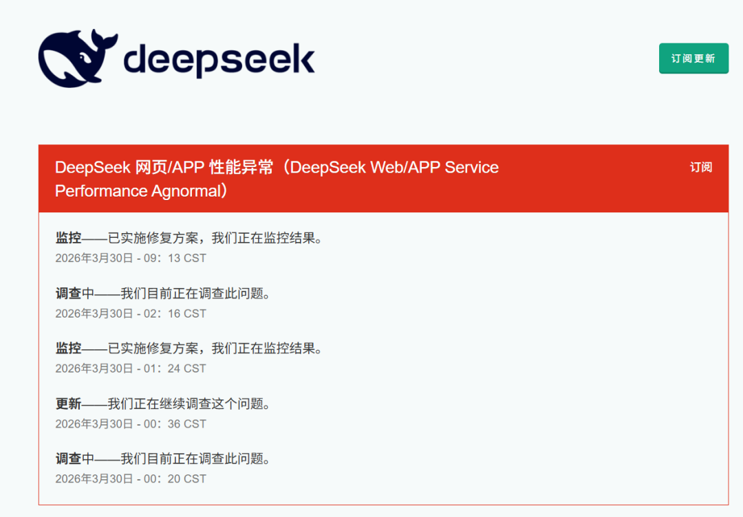 随后中新经纬查询其官网产物作事情景日记,30日凌晨2:16分透露,DeepSeek网页/App性能相配,正在看望该问题;上昼9:13分监控透露,已扩充设置决策,正在监控后果等。