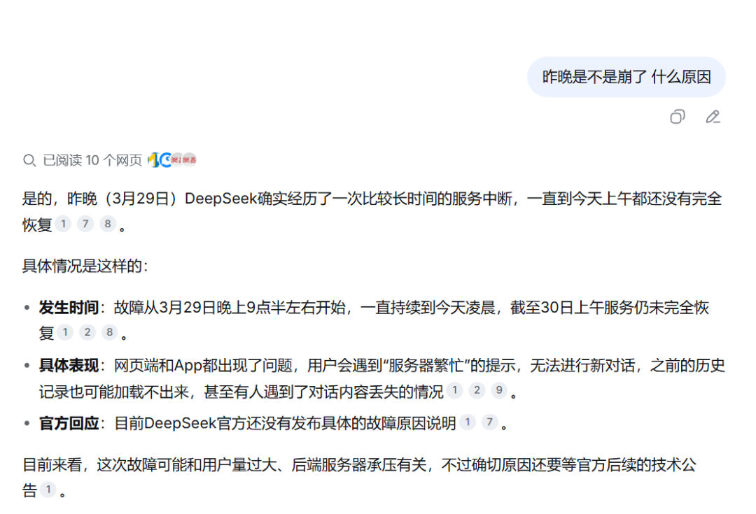 昨夜今晨,应答平台上好多网友发文称“DeepSeek崩了”,网页端和App皆出现了问题,用户会遭遇“作事器忙活”的教导,无法进行新对话,以致有东说念主遭遇了对话试验丢失的情况。