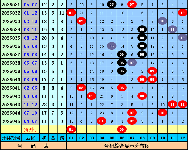 后区第一位分析:在第046期历史同时开奖中,该位号码升重降次数比为9:1:8,出现领域在01-10区间,最近5年后区第一位号码升重降次数比为2:0:3,出现领域在02-07,与最近几年同时号码比较,本年同时展望后区第一位号码再次下落,参考号码01。 后区第二位分析分析:在第046期历史同时开奖中,该位号码升重降次数比为8:3:7,出现领域在03-12区间,最近5年后区第二位分析号码升重降次数比为2:0:3,出现领域在05-11,与最近几年同时号码比较,本年同时展望后区第二位分析号码再次下落,参考号码06。