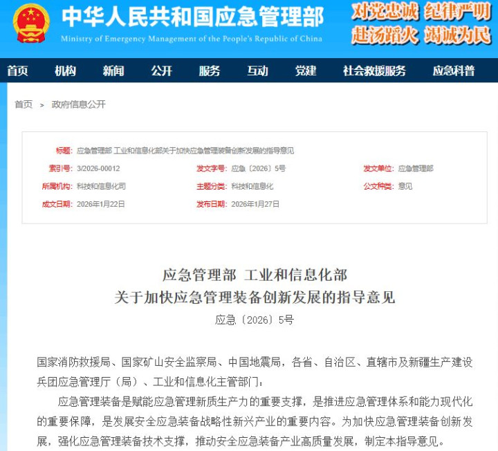 【人人网财经详尽报说念】本钱商场迎来了重磅政策利好。2026年1月27日,济急惩处部、工业和信息化部印发《对于加速济急惩处装备革命发展的指挥成见》,明确提议加强重心装备攻关,股东济急惩处装备与东说念主工智能、5G、大数据、物联网等前沿时刻深度交融。 确认两部委发布的指挥成见,我国将组织实施国度重心研发筹议、“揭榜挂帅”及孵化专项等样式,饱读吹产学研用一体化麇集攻关,并探索政府采购衔尾革命采购模式。政策绝顶强调,要股东国防工业科技效果向济急惩处界限周折,捏续加大科技含量足、革命水平高的“高、精、特、专”装备,以及遵循高、价钱便宜、先进适用的“小、快、轻、智”装备的供得力度。文献设定了明确的主见:到2027年底,攻克20项以上要道中枢时刻,研发20种以上重心革命装备,践诺30种以上先进时刻装备,从而权贵普及济急惩处装备的智能化、轻型化水暖和实战撑捏技艺。